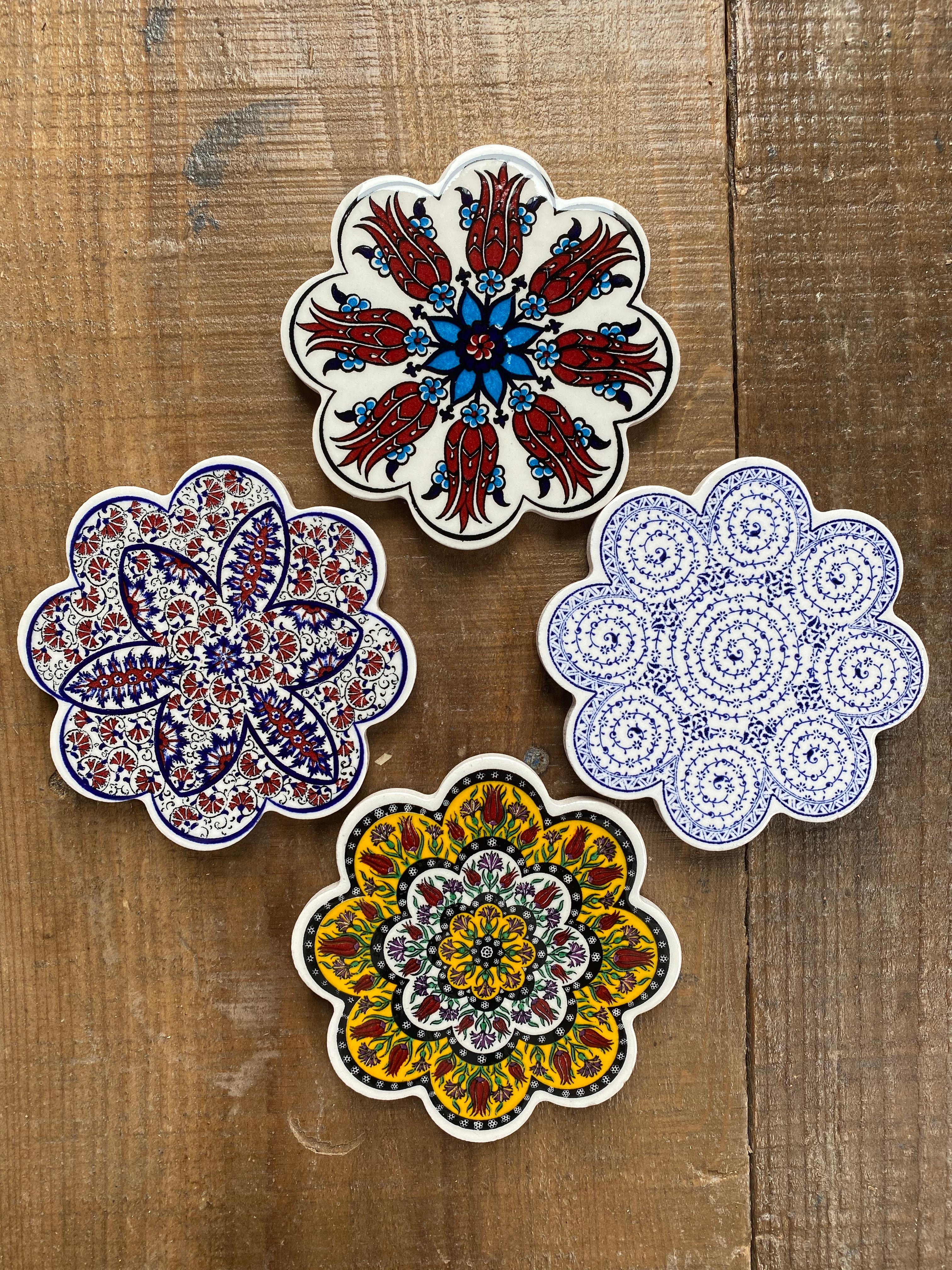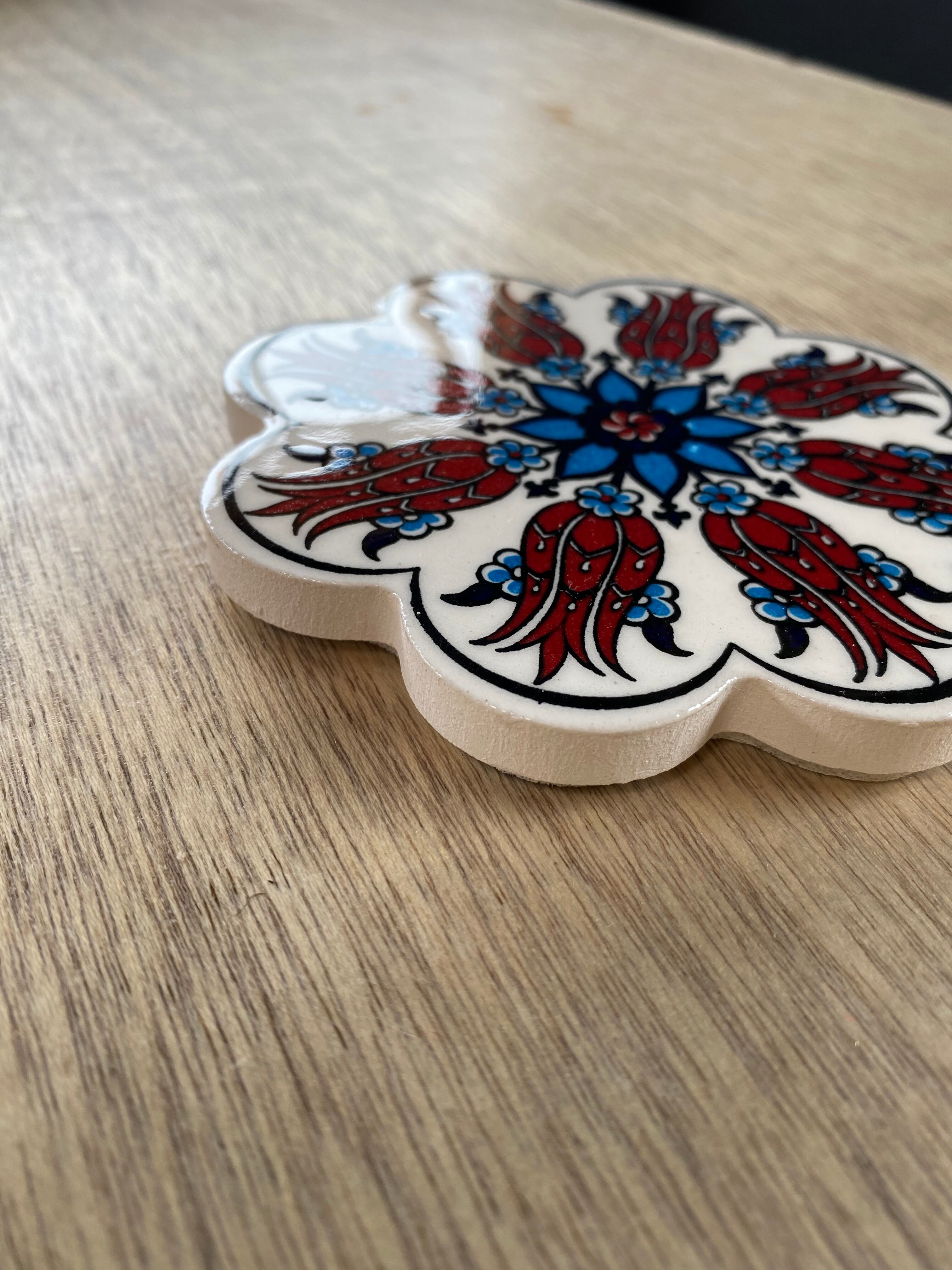 鮮やかで美しいデザインが特徴のトルコ陶器コースター。手作りのため、製品1つ1つに細やかな模様が施されており、ハンドメイドならではの温かみが感じられます。あなたの食卓やお気に入りのカフェで、コーヒーカップやグラスを置いていただくと、おしゃれな雰囲気を演出してくれるはずです。 トルコの伝統的な技術を用いた陶器なので、耐久性があり、割れにくく、また汚れも落ちやすくご使用いただきやすい商品です。お手入れも簡単で、水洗いするだけで清潔に保てます。 世界のおしゃれなカフェでよく使われているアイテムでもあるので、ぜひお部屋や食卓など、様々なシーンで使用してみてください。トルコの美しい陶器であなたの贅沢なティータイムやドリンクタイムを演出してくれます。