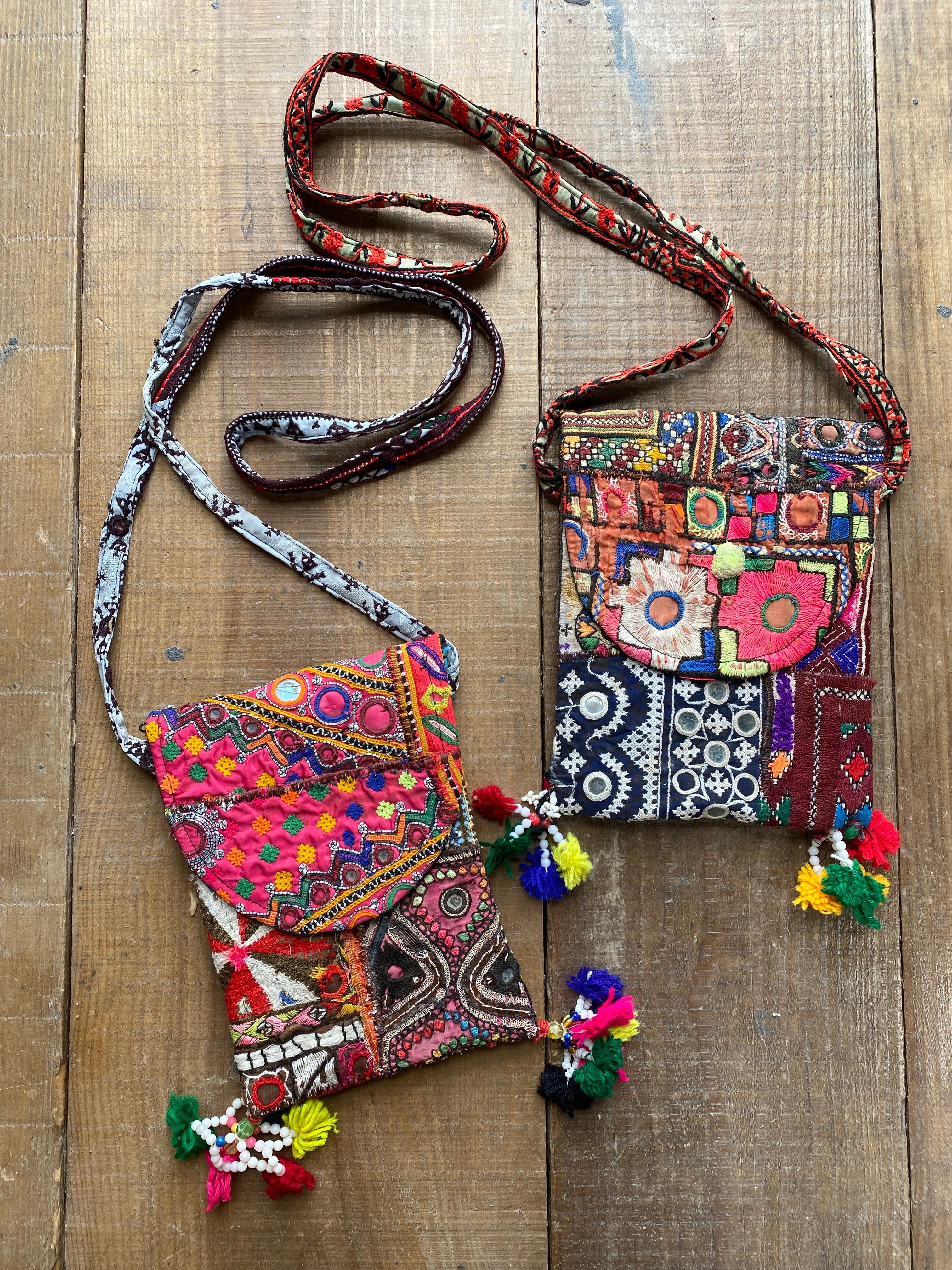 色鮮やかな古布とミラーが目を引くポシェットです。