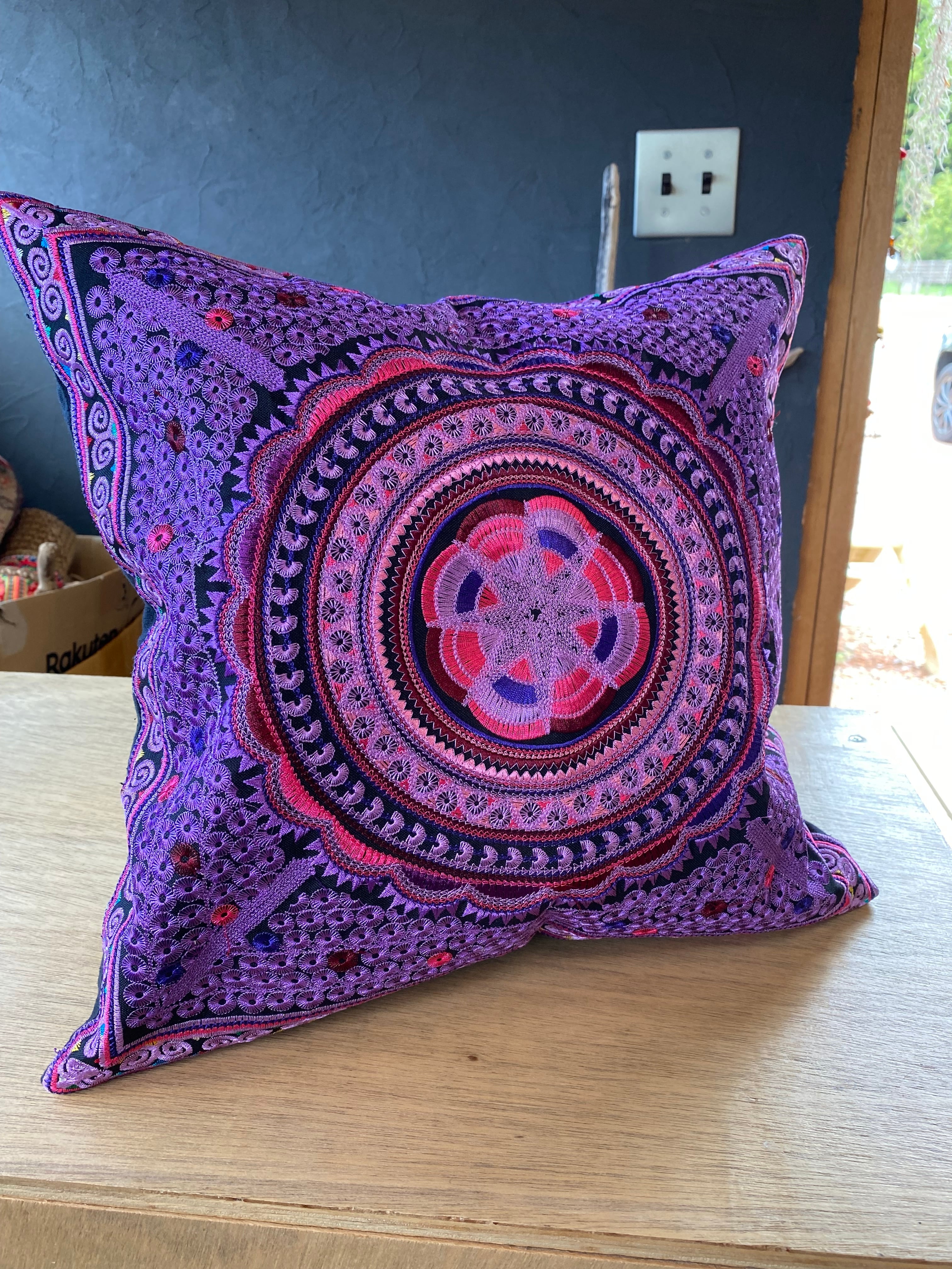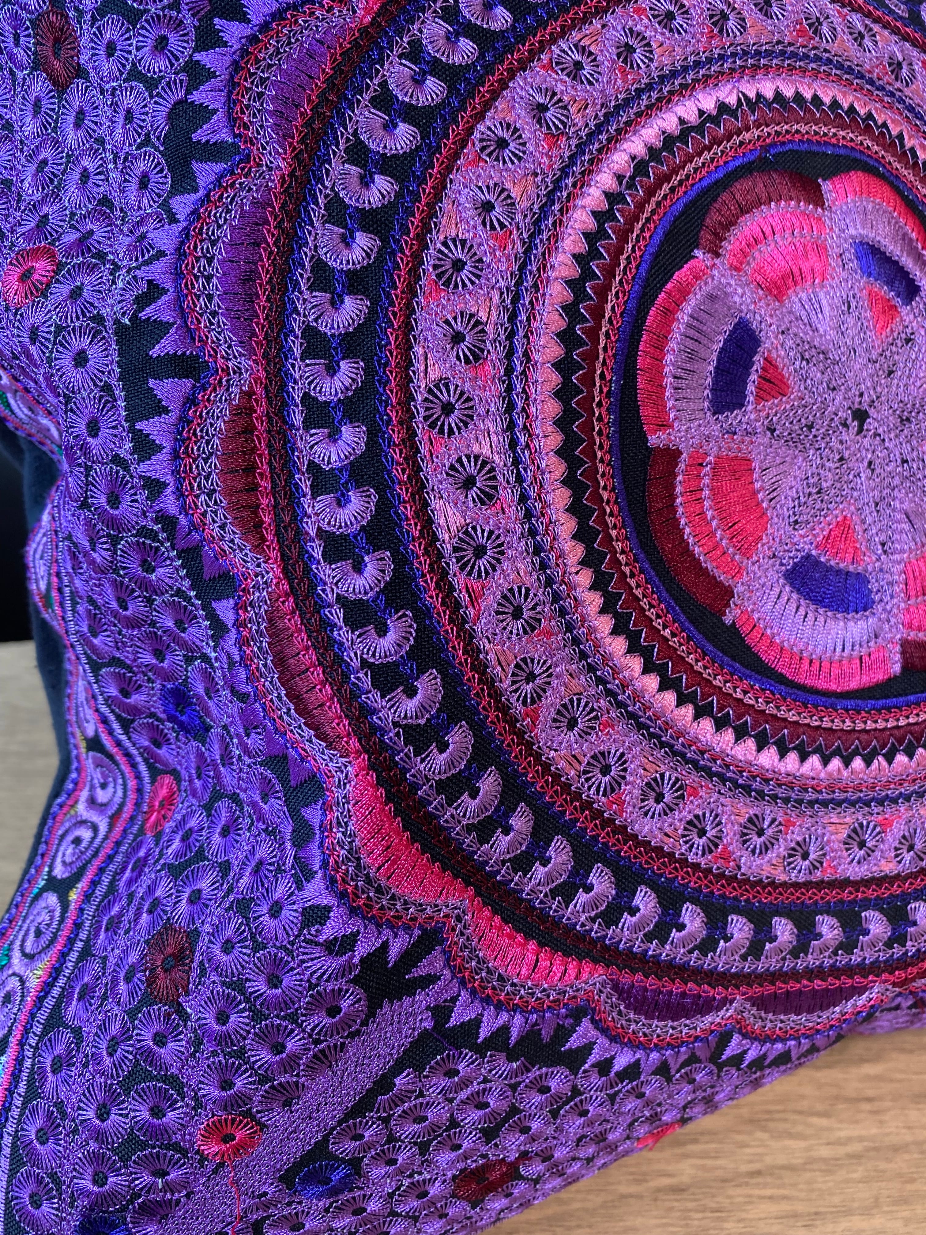 このクッションカバーは、モン族の人々が長年にわたって守り続けてきた伝統的な手法で作られています。柄のデザインには、彼らの経験や感情が込められており、ひとつひとつに意味があります。また、糸の染色にもこだわりがあり、自然の素材を使用しています。そのため、手触りが心地よく、肌にやさしい仕上がりとなっています。