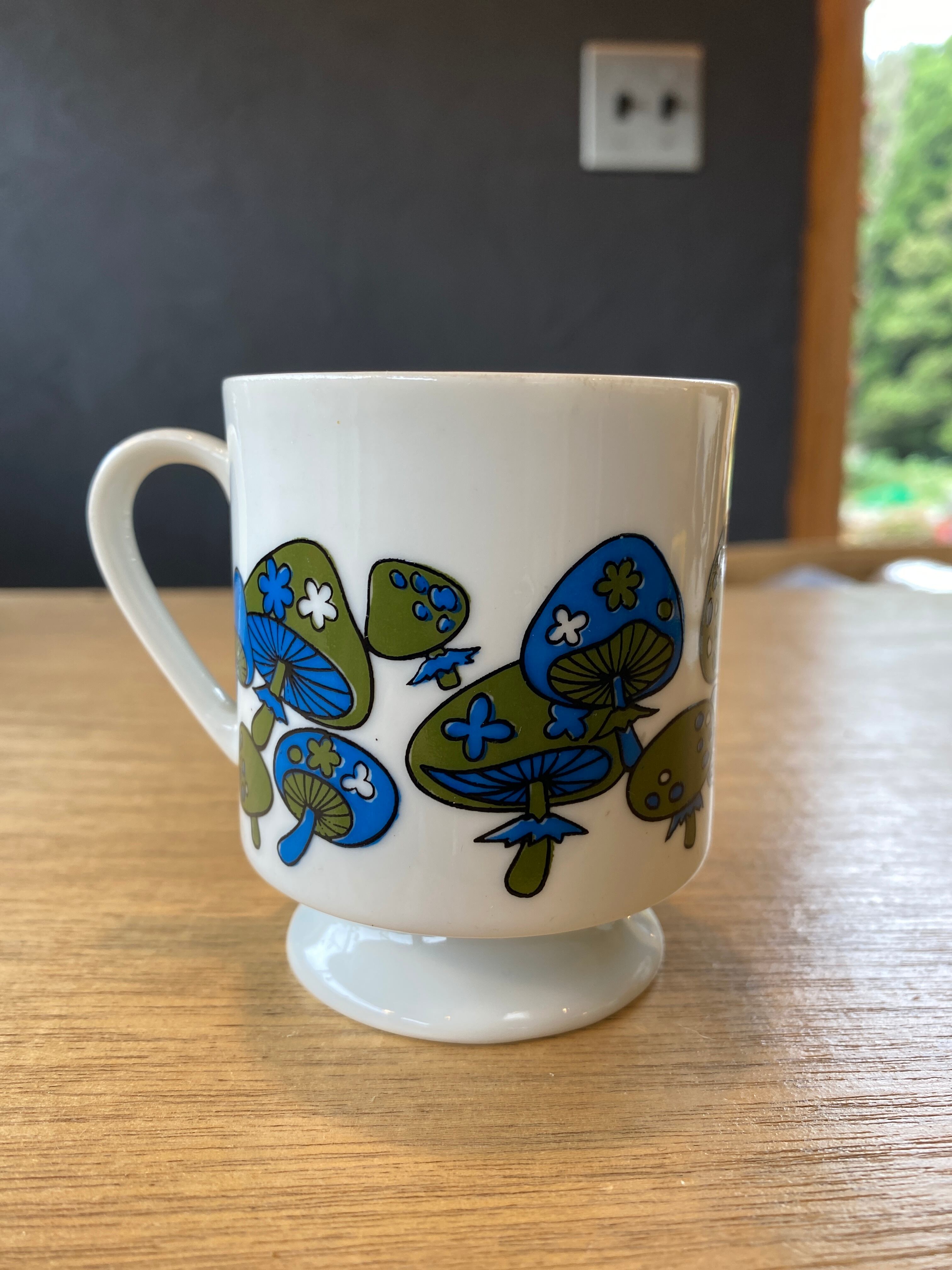 70s USA mushroom pattern magは、大胆な色使いと幻想的なキノコのパターンが特徴のマグカップです。